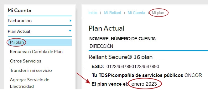 Si ya eres cliente de Reliant, es posible que todavía no se esté acabando tu contrato. Puedes verificar si eres elegible o no para cambiar de plan en tu cuenta en línea. Ingresa a tu cuenta, ve a Plan, y debes ver la fecha de vencimiento de tu plan en la página como se muestra arriba.